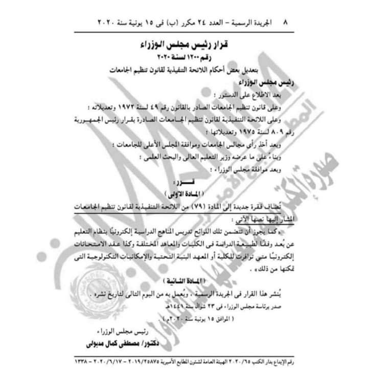 أصدره الدكتور مصطفى مدبولي، رئيس مجلس الوزراء، القرار رقم 1200 لعام 2020 بتعديل بعض أحكام اللائحة التنفيذية لقانون تنظيم الجامعات بحيث تسمح بالتعلم وإجراء الامتحانات عن بعد ( الكترونيا ).
