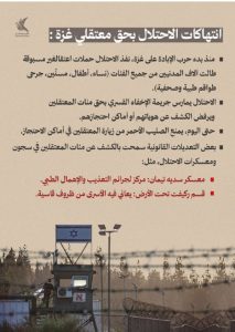 وأفادت مؤسسات الأسرى بأن المعتقلين من غزة يتعرضون لأساليب قاسية من التعذيب الجسدي والنفسي داخل مراكز التحقيق والسجون، وسط حرمان متعمد من الغذاء والعلاج والملابس، وإخفاء قسري طال عددا كبيرا منهم لفترات طويلة.