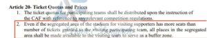 “حتى إذا كانت المنطقة المنفصلة بالملعب المخصصة للمشجعين الزائرين بها مقاعد أكثر من عدد التذاكر الممنوحة للفريق الزائر يجب توفير جميع الأماكن في المنطقة المعزولة للفريق الزائر لتكون بمثابة منطقة عازلة”
