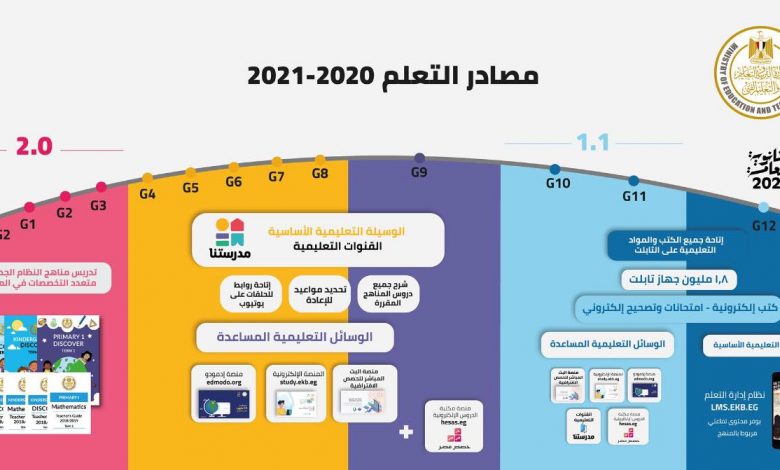 مع قرار استكمال تدريس المناهج الدراسية بنظام التعليم عن بعد اعتباراً من السبت ٢ يناير ٢٠٢١، وحتى نهاية الفصل الدراسي الأول، يستطيع الطلاب في مختلف المراحل المذاكرة من الوسائل التعليمية المتعددة التي تتيحها وزارة التربية والتعليم والتعليم الفني ومنها: