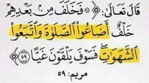 قال تعالى في سورة مريم { فَخَلَفَ مِن بَعْدِهِمْ خَلْفٌ أَضَاعُوا الصَّلَاةَ وَاتَّبَعُوا الشَّهَوَاتِ ۖ فَسَوْفَ يَلْقَوْنَ غَيًّا (59)