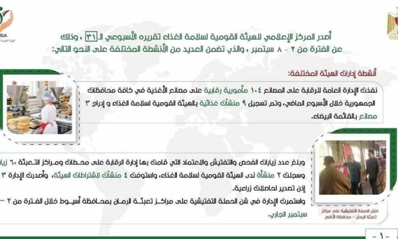 جاء التقرير الأسبوعي ال ٣١ للهيئه القوميه لسلامة الغذاء وذلك عن الفترة من 2 – 8 سبتمبر ليوضح العديد من الأنشطة المختلفة وجهود الهيئه ونشاطها فى محافظات مصر وسنستعرضها على النحو التالي: