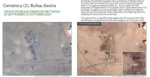 كشف تقرير حديث صادر عن مختبر الأبحاث الإنسانية فى جامعة “ييل” الأمريكية عن رصده لاتساع رقعة المقابر فى عدد من مناطق ولاية الجزيرة، تتضمن كلاً من مدن السريحة ورفاعة، وذلك بين 29 من سبتمبر و31 أكتوبر 2024.
