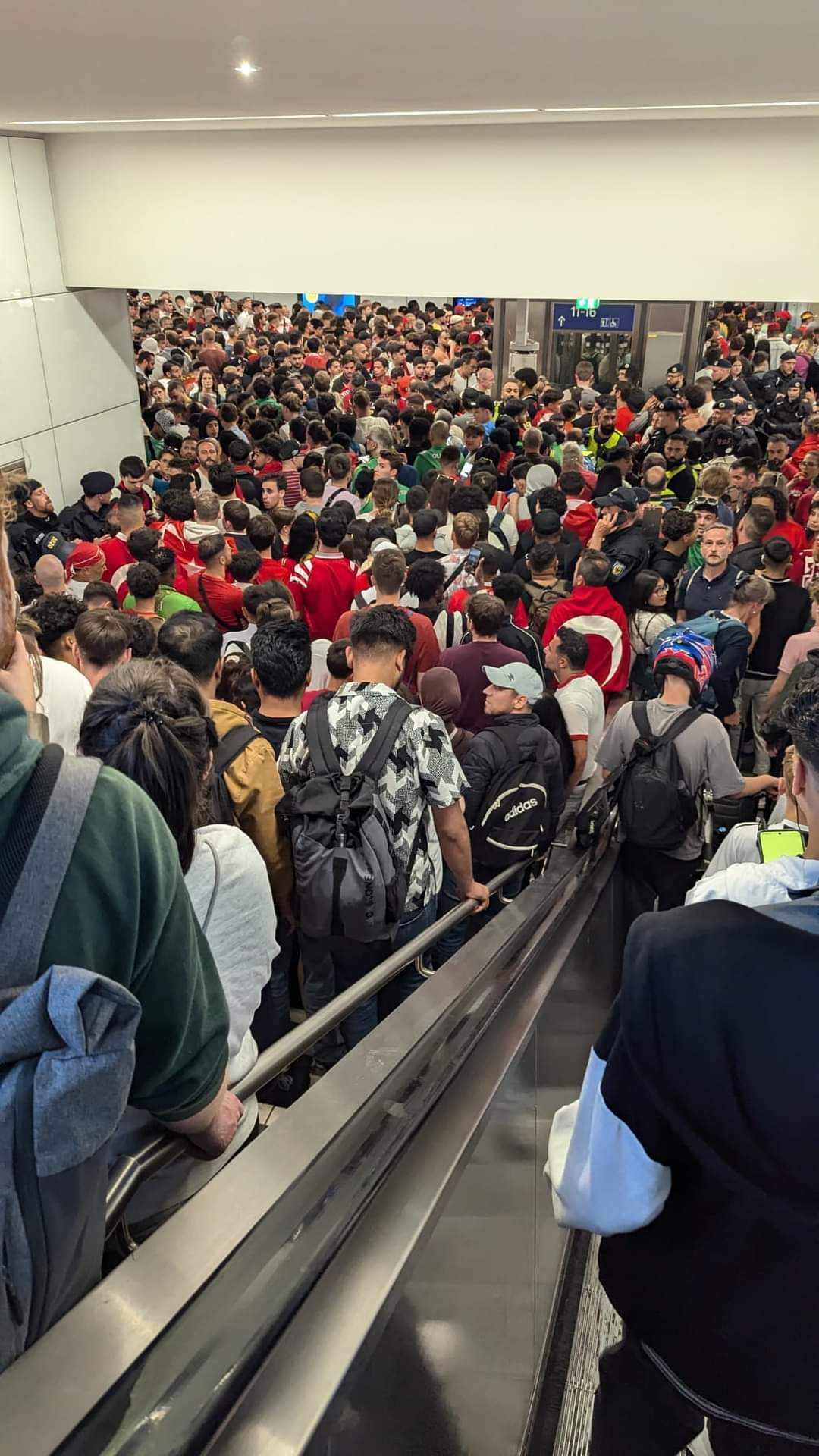 يقول عنوان التقرير “يورو 2024 والكفاءة الألمانية – انسَ كل ما كنت تعتقد أنك تعرفه”. الصورة الرئيسية: ممر سلالم مزدحم للغاية.