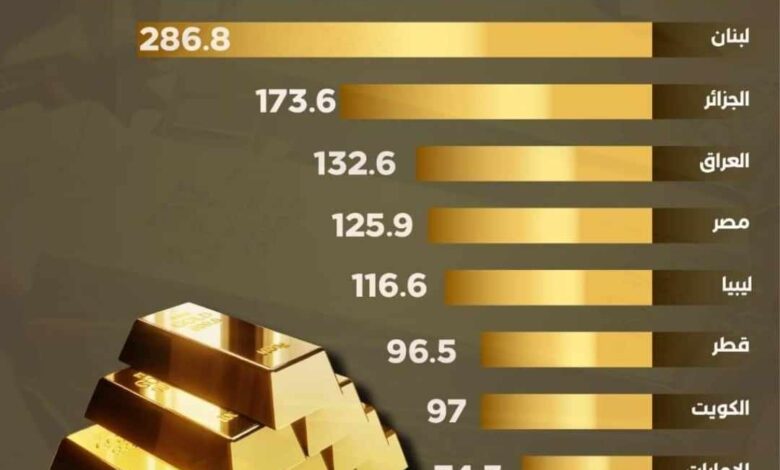 ووفقاً لتقرير مجلس الذهب العالمي، الذي يبين ما تمتلكه البنوك المركزية من ذهب، فإن 5 دول عربية تستحوذ على حصة الأسد (نحو 69%) من إجمالي احتياطيات الدول العربية من المعدن الأصفر.
