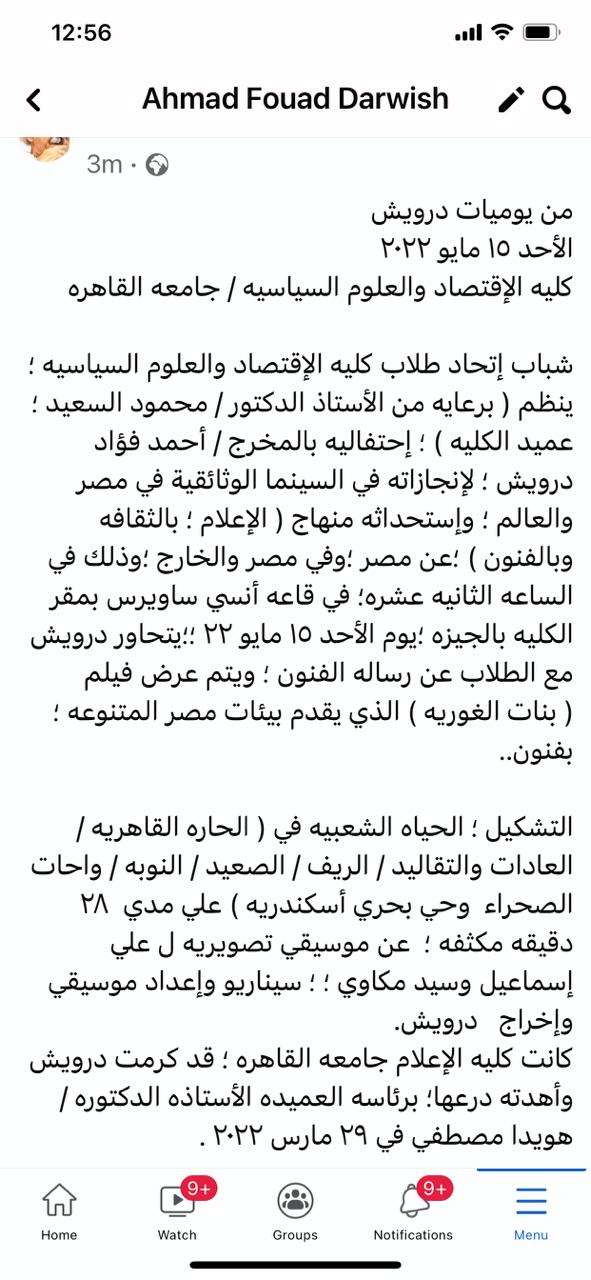 كلية الإقتصاد والعلوم السياسية سوف تقوم بتكريم المخرج الكبير الكاتب أحمد فؤاد درويش ؛ في كليه الإقتصاد والعلوم السياسيه وذلك في الثانية عشر ظهر يوم الأحد القادم، الموافق 15 مايو 2022 .