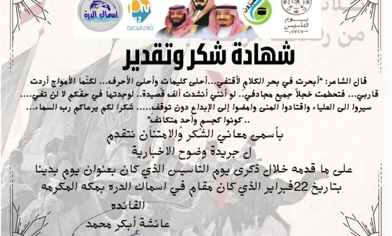تكريم جريدة وضوح لمشاركتها في الإحتفالية الأولى بذكرى “يوم التأسيس”بالسعودية