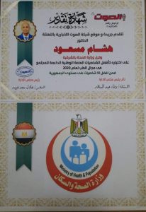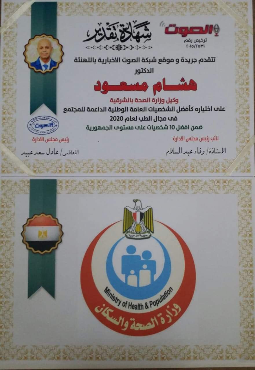 كرمت اليوم الثلاثاء 16 فبراير 2021 مؤسسة الصوت الإخبارية الدكتور هشام شوقي مسعود وكيل وزارة الصحة بالشرقية، جاء ذلك بعد اختياره ضمن أفضل 10 شخصيات وطنية علي مستوي الجمهورية فعالة وبارزة في آداء عملها، وداعمه للمجتمع في مجال الطب لعام 2020، ونظراً لجهوده المخلصة في تطوير ورفع كفاءة الخدمات الطبية المقدمة للمواطنين بمحافظة الشرقية، والإنجازات التي تحققت في المنظومة الصحية خلال العام الماضي للإرتقاء بمستوي الخدمة.