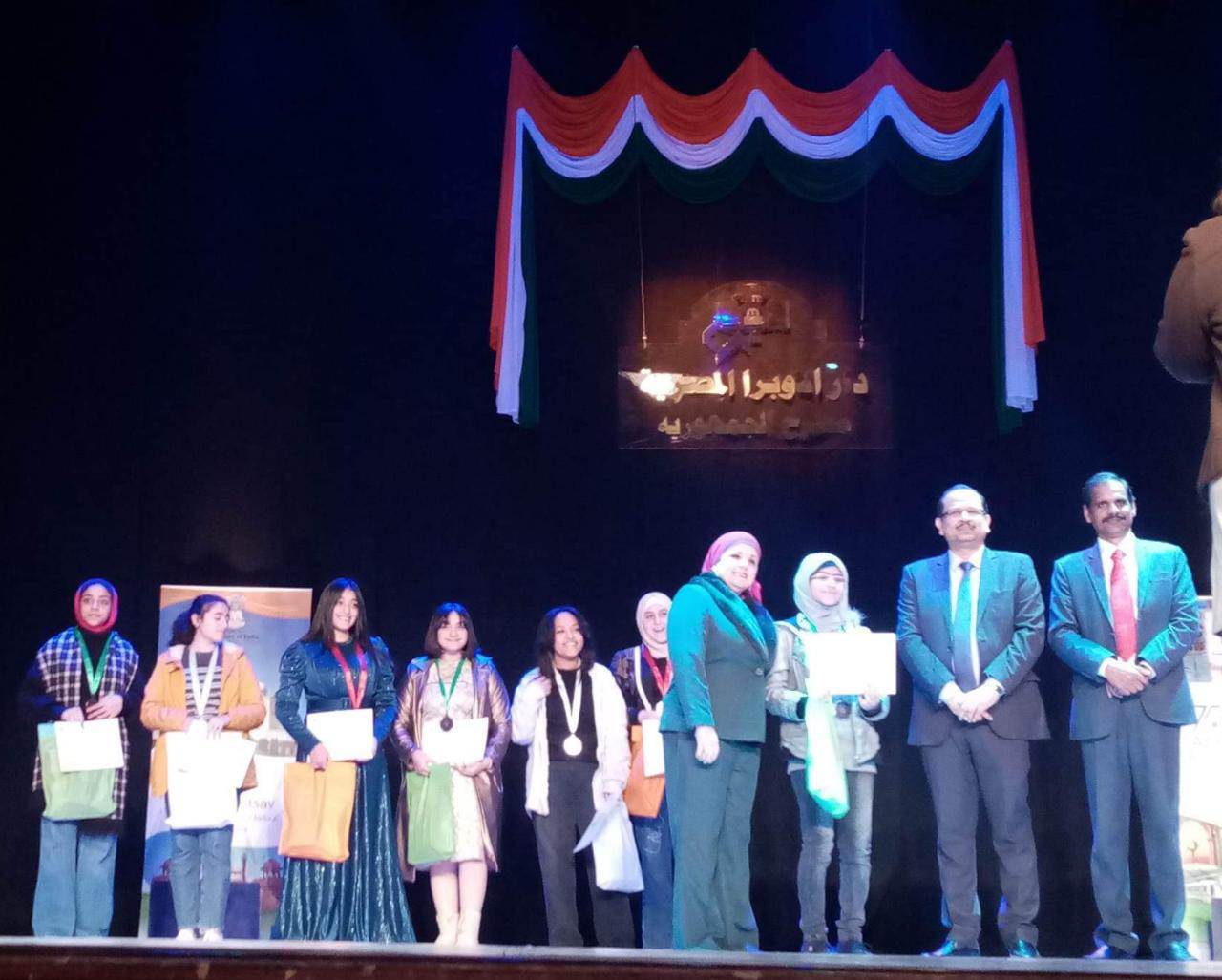 وبحضور الدكتورة رباب عبد المحسن مدير عام تنمية مادة التربية الفنية، ونائب سفير الهند والسادة المسئولين بالسفارة ومركز مولانا آزاد الثقافي الهندي بالقاهرة وأولياء أمور الطلاب الفائزين.