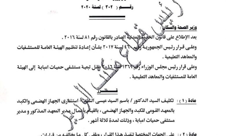 أصدرت الدكتورة هالة زايد وزيرة الصحة والسكان القرار الوزاري رقم 202 لسنة 2020، بتكليف الدكتور باسم السيد عيسي، استشاري الجهاز الهضمي والكبد بالمعهد القومي للكبد والجهاز الهضمي، بالقيام بأعمال مدير المعهد ومدير مستشفى حميات إمبابة، وذلك لمدة ثلاثة أشهر.