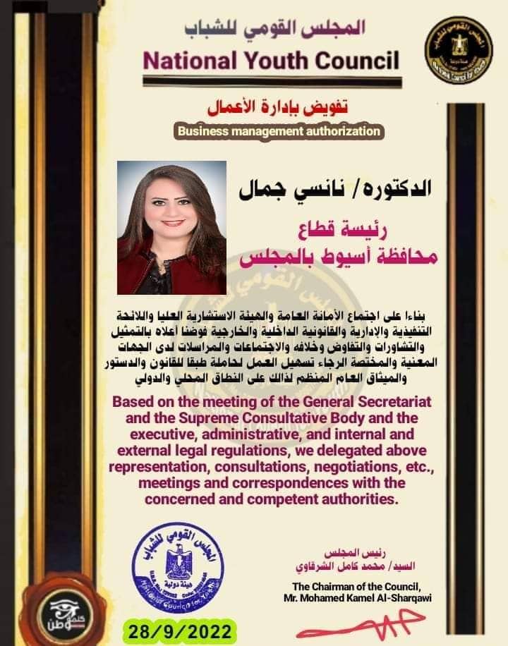 يتقدم الصحفى محمدعبدالراضى يونس مراسل جريدة وموقع وضوح الاخبارى باسيوط بخالص التهانى للدكتورة نانسى جمال لاختيارها رئيس قطاع المجلس القومي للشباب باسيوط.