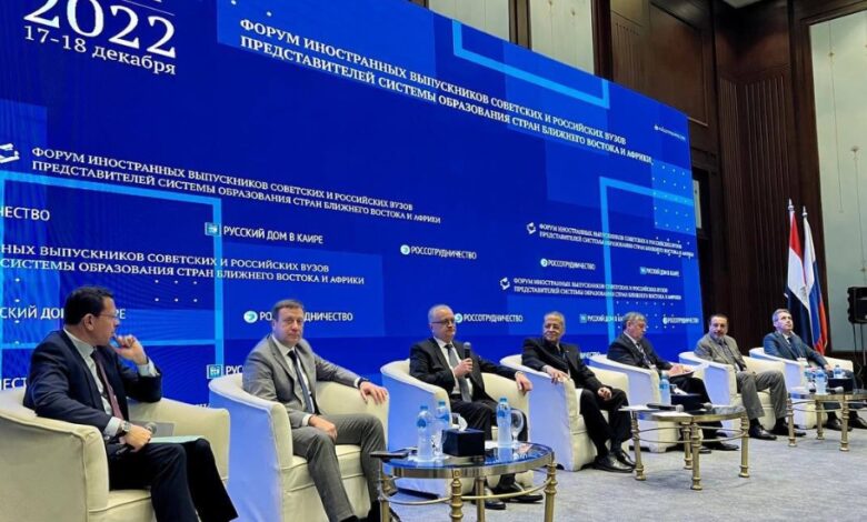 وكانت فعاليات المنتدى قد انطلقت الاسبوع الماضي بالقاهرة بحضور السفير الروسي جيورجي بوريسينكو، وبافل شفيتسوف نائب رئيس الوكالة الفيدرالية للتعاون الدولي، ود/ صالح هاشم ممثلا عن وزير التعليم العالي د/ أيمن عاشور، ود/ طوني معلوف رئيس الاتحاد العربي لخريجي الجامعات السوفيتية والروسية، وشريف جاد رئيس الجمعية المصرية لخريجي الجامعات الروسية والسوفيتية، حيث توالت برقيات التهنئة من وزارات التعليم العالي من الدول المشاركة وسفاراتها بالقاهرة.
