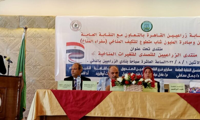 نظمت نقابة زراعيين القاهرة بالتعاون مع النقابة العامة للزراعيين ومبادرة المليون شاب متطوع للتكيف المناخي ( سفراء المناخ ) بتنظيم منتدي تحت عنوان ( منتدي الزراعيين للتصدي للتغيرات المناخية ) وذلك بالأمس يوم الاثنين الموافق 1 / 8 / 2022 بمقر نادي الزراعيين بالدقي برئاسة الاستاذ الدكتور/ السيد خليفة النقيب العام للزراعيين والأستاذة الدكتورة / مرفت أبو اليزيد نقيب زراعيين القاهرة والساده أعضاء هيئة مكتب فرع القاهرة ، كما شرفنا في هذا المنتدي بإستضافة عدد كبير من علماء المناخ والتصحر والمحاصيل وغيرهم في المجالات المختلفة وتحدث في هذا المنتدي الأستاذ الدكتور / مجدي علام مستشار مرفق البيئة العالمي ورئيس الاتحاد النوعي للمناخ والاستاذ الدكتور / نعيم مصيلحي رئيس مركز بحوث الصحراء الأسبق والاستاذ الدكتور/ عبدالعظيم طنطاوي رئيس مركز البحوث الزراعية الأسبق والاستاذ الدكتور / احمد محمد كردي رئيس قسم وقاية النبات بكلية الزراعة سابا باشا بالإسكندرية والدكتور/ مصطفي الشربيني سفير الميثاق الاوربي والاستاذ / حسام الدين محمود الأمين العام لمؤسسة الفريق التطوعي العمل الانساني والاستاذ الدكتور/ طاهر فايد رئيس قسم المحاصيل بكلية الزراعة جامعة عين شمس وعدد كبير من نقباء وأعضاء مجلس أفرع النقابة المختلفة كفرع الجيزة وفرع بني سويف وفرع سوهاج وفرع اسكندرية وفرع اسوان ومطروح والقليوبية وبورسعيد وغيرها من فروع النقابة علي مستوي الجمهورية ، كما يتقدم مجلس نقابة زراعيين القاهرة بالشكر والتقدير لكل موظفي فرع القاهرة في تنظيم وإعداد هذا المنتدي لاستخراجه في أفضل صورة .