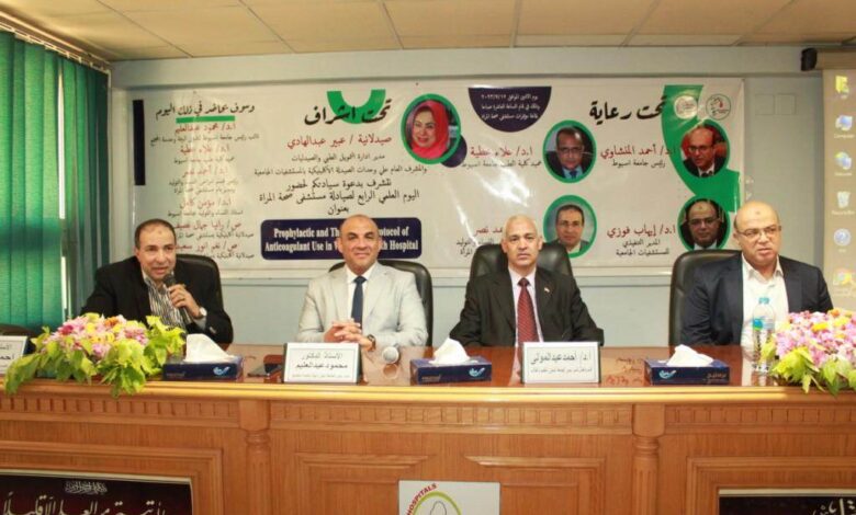 فعاليات اليوم العلمي الرابع لصيادلة مستشفي صحة المرأة حول بروتوكول مضادات التجلط خلال فترة الحمل وبعد الولادة وفي مختلف أمراض النساء تحت رعاية الدكتور أحمد المنشاوي رئيس جامعة أسيوط