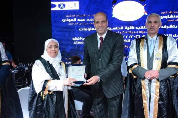 و في ختام الإحتفال أهدى طلاب الكلية درعاً تقديرية للدكتور أحمد عبد المولي القائم بعمل نائب رئيس الجامعة لشئون التعليم والطلاب , والدكتورة مها غانم نائب رئيس الجامعة لشئون خدمة المجتمع وتنمية البيئة , الدكتورة تيسير حسن سليمان عميد كلية الحاسبات والمعلومات , فضلاً عن تكريم الأستاذ شوكت صابر أمين عام الجامعة, إلي جانب تكريم طلاب الكلية تقديراً لمجهوداتهم..
