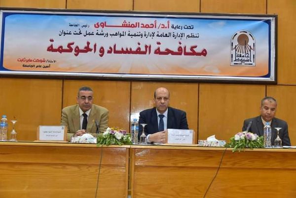 وفى ذلك الاطار نظمت الإدارة العامة لإدارة وتنمية المواهب بجامعةأسيوط ورشة عمل حول مكافحة الفساد والحوكمة تحت رعاية الدكتور أحمد المنشاوي رئيس جامعة أسيوط وبحضور المحاسب شوكت صابر أمين عام جامعة أسيوط والمحاسب أسامة السيد أمين عام مساعد جامعة أسيوط وخالد عمران مدير عام الإدارة العامة لإدارة وتنمية المواهب بجامعة أسيوط وبمشاركة نحو ٥٥ةمن العاملين بالقطاع المالي بالجامعة وذلك في إطار خطة الجامعة؛ لنشر قيم النزاهة والشفافية، ومواجهة ومكافحة الفساد، بمقر قاعة المناقشات بالمبني الإداري بالجامعة
