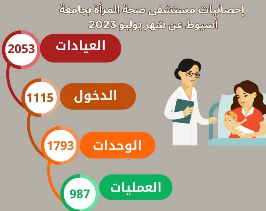 كما استقبلت مستشفى صحة المرأة بجامعةأسيوط2053 متردداً بالعيادات الخارجية خلال شهر يوليو 2023  تحت رعاية الدكتور أحمد المنشاوي رئيس جامعةأسيوط والدكتور علاء عطية عميد كلية الطب ورئيس مجلس إدارة مستشفيات أسيوط الجامعية والدكتور إيهاب فوزي المدير التنفيذي لمستشفيات أسيوط الجامعية والدكتور أحمد نصر مدير مستشفى صحة المرأة بجامعة أسيوط