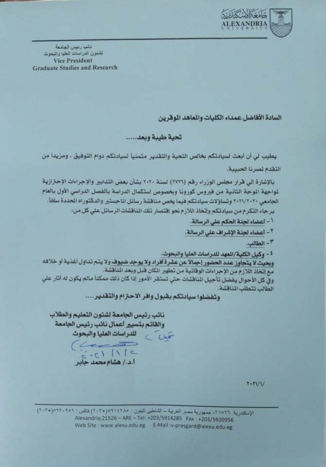 أضدر الدكتور هشام جابر، نائب رئيس جامعة الاسكندرية لشئون التعليم والطلاب والقائم بعمل نائب رئيس الجامعة لشئون الدراسات العليا والبحوث قرارا بان لا يزيد عدد الحضور لمناقشات رسائل الدكتوارة والماجستير المحددة سلفا عن 10 اشخاص دون حضور ضيوف موزعين كالتالي :