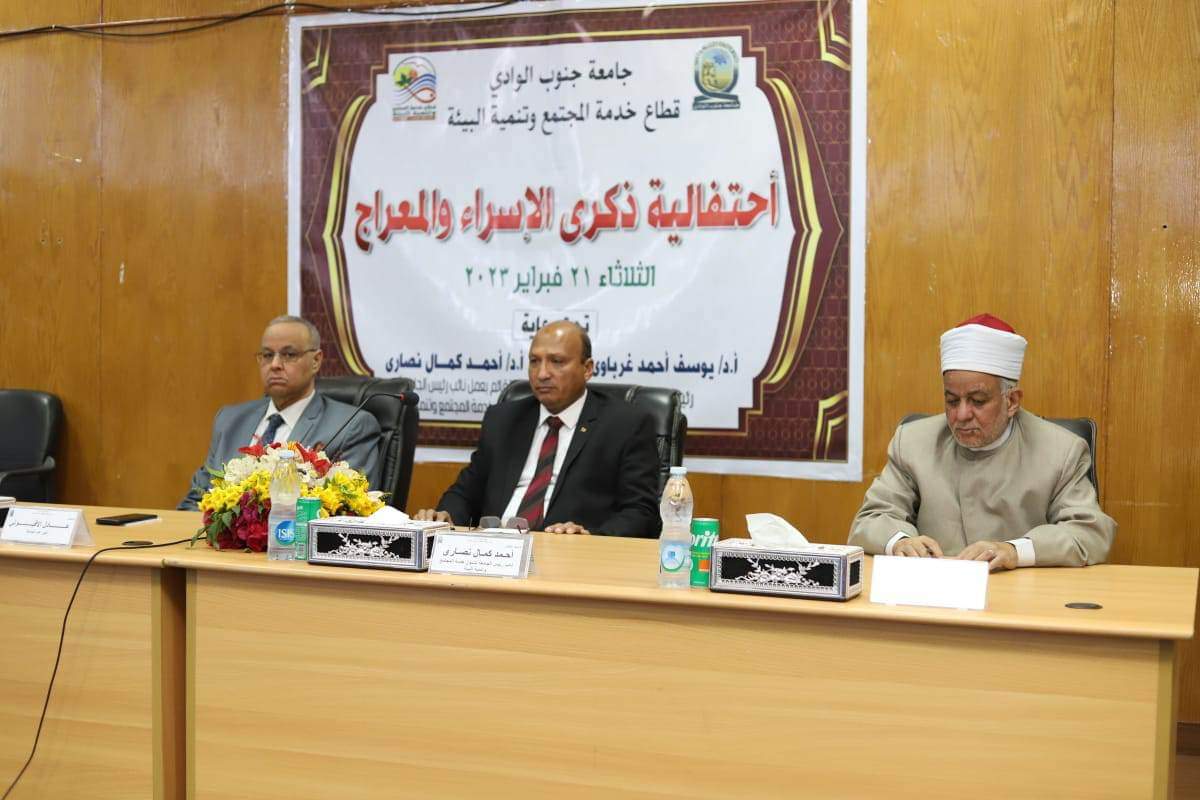 إيماناً من جامعة جنوب الوادي ، بأهمية الأنشطة الطلابية وحرصاً منها على تنوعها على مدار العام الدراسي لتلبية كافة رغبات الطلاب وتحت رعاية الدكتور يوسف غرباوي رئيس الجامعة نظم قطاع خدمة المجتمع وتنمية البيئة تحت إشراف الدكتور أحمد كمال نصاري نائب رئيس الجامعة لشئون خدمة المجتمع وتنمية البيئة ، احتفالية بمناسبة ذكرى الإسراء والمعراج ، بحضور عادل احمد مصطفى أمين عام الجامعة تحدث فيها الدكتور أحمد أبوالوفا محمد تاج الدين مدير الدعوة بمديرية أوقاف قنا .