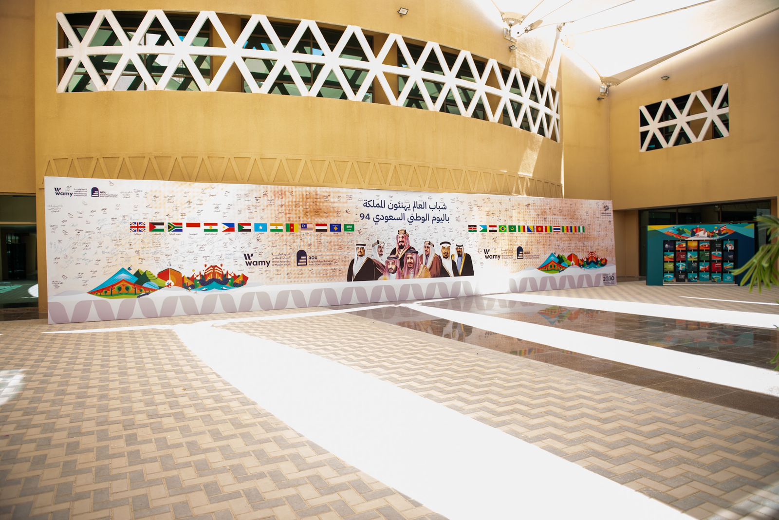 ودشنت الندوة مع منسوبيها وطلبة الجامعة العربية المفتوحة (جدارية شباب العالم يهنئون المملكة باليوم الوطني 94) وذلك من خلال رصد توقيعات مئات الشباب والشابات من قرابة 30 دولة حول العالم يهنئون المملكة بأجمل العبارات مع شعار (نحلم ونحقق) من خلال جدارية صُممت بهوية اليوم الوطني السعودي وبمساحة إجمالية طولها 94 متر مربع، لتكون ذكرى عالمية لهذا اليوم العظيم، وتسطر مشاعر هؤلاء الشباب وطموحاتهم لمواصلة خدمة الوطن والسعي لتحقيق مستقبل أكثر إشراقًا لأجيالنا القادمة.