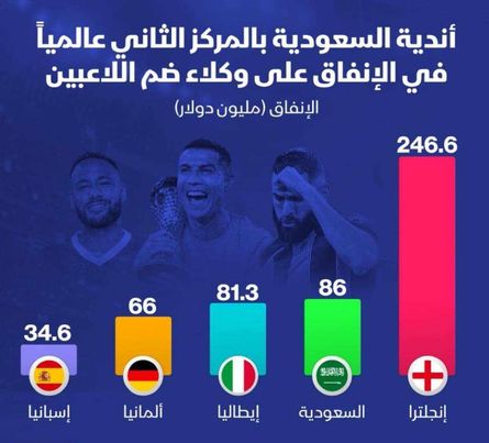 *أنفقت الأندية السعودية نحو 86 مليون دولار على وكلاء اللاعبين في الصفقات، الخارجية التي ضمتها خلال عام 2023، لتأتي في المركز الثاني عالمياً.