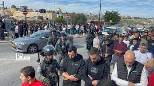 *رافعين الدعاء لأهالي غزة رغم تواجد القوات الإسرائيلية، مقدسيون يؤدون صلاة “الجمعة” على الأسفلت في حي واد الجوز بعد منعهم من أدائها في المسجد_الأقصى.