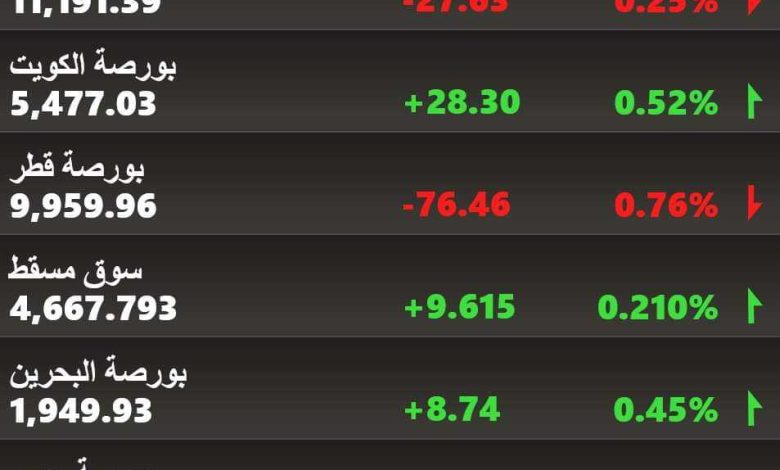 *الأخضر يهيمن على إغلاق الأسواق_الخليجية باستثناء السعودية وقطر رغم تراجع النفط أكثر من 0.5%.. البورصة المصرية ترتفع بنحو 700 نقطة بعد سلسلة تراجعات من مستوياتها القياسية لجني الأرباح.