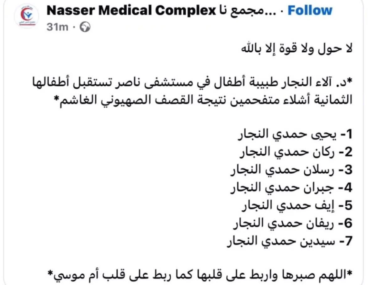 استقبلت آلاء النجار طبيبة أطفال فلسطينية في مستشفى ناصر بقطاع غزة أطفالها السبعة أشلاء متفحمين نتيجة القصف الاسرائيلي الغاشم، واثنين آخرين من العائلة، ونشرت مستشفى ناصر على صفحتها أسماء الأطفال :