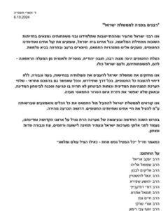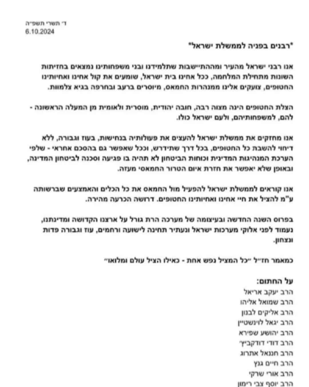 وتبع ما تم نشره حسب هيئة البث الإسرائيلية، طلب الحاخامات، في رسالتهم، من نتنياهو “العمل بكل طريقة ممكنة لإعادة المحتجزين، ومن جملة ذلك من خلال اتفاق مسؤول لا يُعرض أمن إسرائيل لخطر”، حسب تعبيرهم”. وأكدوا مع ذلك على “ضرورة هزيمة الفصائل الفلسطينية” أيضًا”.
