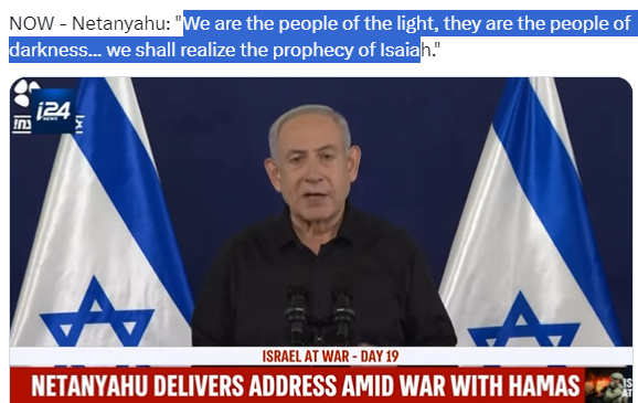 تحدّث نتنياهو اليوم في خطابه إلى العالم، فقال: “نحن أبناء النور، وهم أبناء الظلمة… وسنحقّق نبوءة [النبي] إشعياء..”.