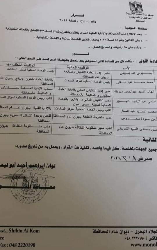 بالأسماء .. حركة تنقلات محدودة بالجهاز الإداري بمحافظة المنوفية