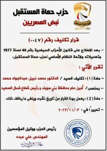 بعد الاطلاع على قانون الأحزاب السياسية رقم 40 لسنة 1977 وتعديلاته ولائحة النظام الاساسي لحزب حُماة المستقبل تقرر الأتي: