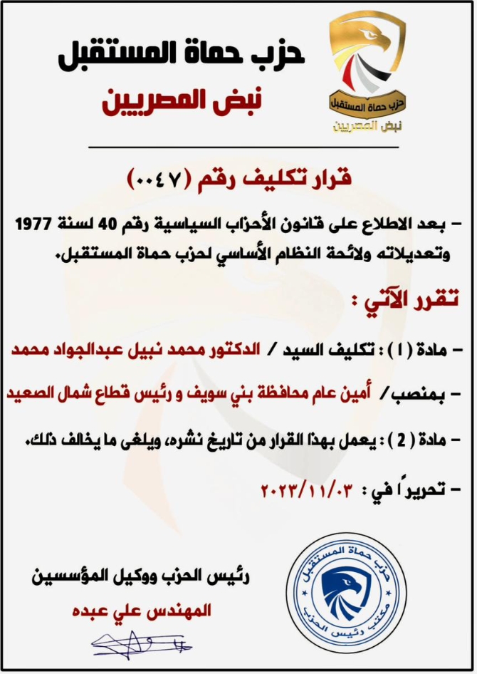 حزب حُماة المستقبل: تعيين د. محمد نبيل أمينًا عامًا لمحافظة بني سويف