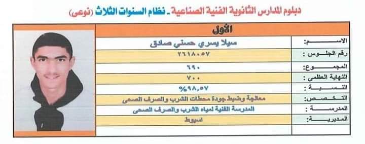 اعلنت شركة مياه الشرب والصرف الصحي بأسيوط والوادي الجديد اليوم الخميس عن حصول الطالب سيلا يسري من المدرسة الثانوية الفنية لمياه الشرب والصرف الصحي بأسيوط والوادي الجديد على المركز الأول على مستوى الجمهورية في امتحانات الدبلومات الفنية للمدارس الثانوية الفنية بتحقيق نسبة 97.57% من المجموع الكلي