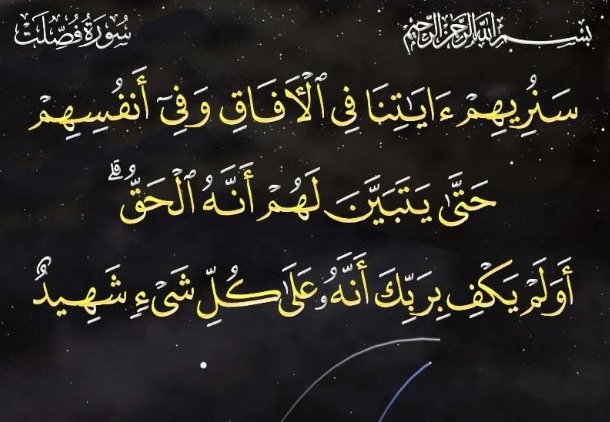 ﺳﺒﺤﺎﻥ ﺍﻟﻠﻪ . ﻭﺻﺪﻕ ﺍﻟﻠﻪ ﺍﻟﻌﻈﻴﻢ ﺇﺫ ﻳﻘﻮﻝ : (ﺳَﻨُﺮِﻳﻬِﻢْ ﺁﻳَﺎﺗِﻨَﺎ ﻓِﻲ ﺍﻵﻓَﺎﻕِ ﻭَﻓِﻲ ﺃَﻧْﻔُﺴِﻬِﻢْ ﺣَﺘَّﻰ ﻳَﺘَﺒَﻴَّﻦَ ﻟَﻬُﻢْ ﺃَﻧَّﻪُ ﺍﻟْﺤَﻖُّ ﺃَﻭَﻟَﻢْ ﻳَﻜْﻒِ ﺑِﺮَﺑِّﻚَ ﺃَﻧَّﻪُ ﻋَﻠَﻰ ﻛُﻞِّ ﺷَﻲْﺀٍ شهيد)