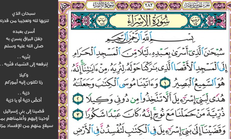 ثمَّ أسرِي برسول الله ﷺ لَيْلًا من الْمَسْجِد الْحَرَام إِلَى الْأَقْصَى.