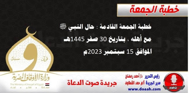 خطبة الجمعة الموافق 15 سبتمبر 2023…. حال النبي صلى الله عليه وسلم مع أهله