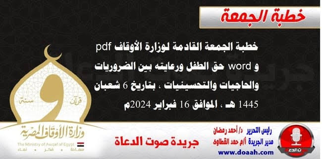 خطبة الجمعة الموافق 16 فبراير 2024….حق الطفل ورعايته بين الضروريات والحاجيات والتحسينيات
