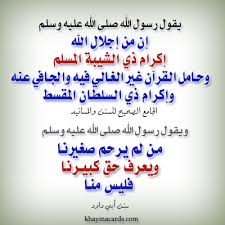 وعَنْ أَبِي مُوسَى الْأَشْعَرِيِّ، قَالَ: قَالَ رَسُولُ اللَّهِ صَلَّى اللهُ عَلَيْهِ وَسَلَّمَ: «إِنَّ مِنْ إِجْلَالِ اللَّهِ إِكْرَامَ ذِي الشَّيْبَةِ الْمُسْلِمِ، وَحَامِلِ الْقُرْآنِ غَيْرِ الْغَالِي فِيهِ وَالْجَافِي عَنْهُ، وَإِكْرَامَ ذِي السُّلْطَانِ الْمُقْسِطِ».رواه أبو داوود.