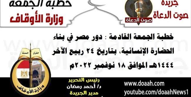 خطبة الجمعة الموافق18 نوفمبر 2022…دور مصر في بناء الحضارة الإنسانية.