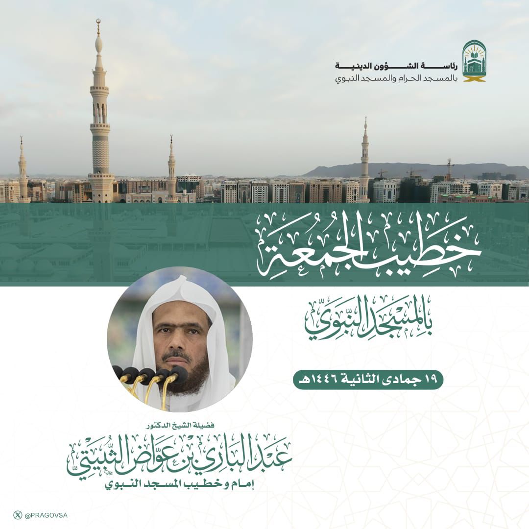 أصدرت رئاسة الشؤون الدينية بالمسجد الحرام والمسجد النبوي امام وخطيب صلاة الجمعة ١٩ جمادى الآخرة ١٤٤٦هـ