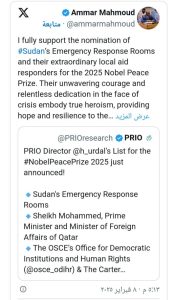 أعلن نائب مندوب السودان لدى الأمم المتحدة، السفير عمار محمود، دعمه الكامل لترشيح غرف الطوارئ في السودان ومستجيبيها المحليين لنيل جائزة نوبل للسلام لعام 2025، مشيدًا بشجاعتهم وتفانيهم في مواجهة الأزمة الإنسانية التي تعصف بالبلاد.