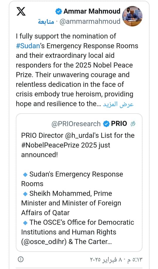 “إنني أؤيد تمامًا ترشيح غرف الطوارئ في السودان ومستجيبيها المحليين الاستثنائيين لجائزة نوبل للسلام لعام 2025. إن شجاعتهم التي لا تتزعزع وتفانيهم الدؤوب في مواجهة الأزمة يجسدان البطولة الحقيقية، ويوفران الأمل والقدرة على الصمود لشعب السودان.”