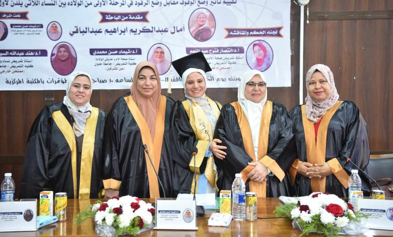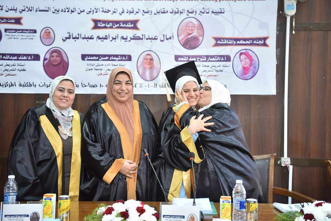 حصلت الباحثة أمال عبدالكريم إبراهيم أبوزيد على درجة الماجستير في التمريض من كلية التمريض بجامعة حلوان بتقدير ممتاز، وذلك عن رسالتها المعنونة بــ: تقييم تأثير وضع الوقوف مقابل وضع الرقود في المرحلة الأولى من الولادة بين النساء اللاتي يلدن لأول مرة، وقد تمت الدراسة على عينة بلغ حجمها (50) من السيدات اللاتي يلدن لأول مرة، وتم تقسيم هذه العينة إلى مجموعتين، مجموعة تمت الولادة لها في وضع الوقوف، والمجموعة الأخرى في وضع الرقود.