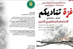 وتابع: “نطلق هذه الدعوة على لسان كل طفل ذبيح، وكل امرأة مكلومة، وكل شيخ مقهور في غزة، للاستنفار نصرةً لأهلنا في فلسطين، ورفضاً للمجازر المدعومة أمريكياً”.