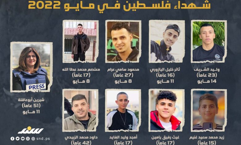 فقد ارتقت أرواح شهداء (((70))) فلسطيني خلال خمسة أشهر فقط منذ بداية العام الحالي 2022 حتى نهاية شهر مايو2022م على أيدي الجنود الصهاينة الذين قتلوهم بدماء باردة وكأنهم لايقتلون بشراً.