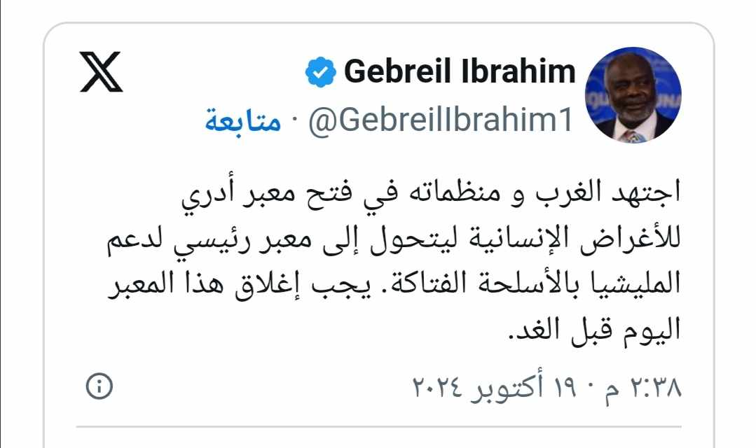 في سياق منفصل، دعا جبريل إبراهيم، رئيس حركة العدل والمساواة ووزير المالية، إلى إغلاق معبر أدرى الحدودي بين السودان وتشاد، مشيرًا إلى أنه يستخدم لتزويد قوات الدعم السريع بالأسلحة. ودعا إلى إغلاق المعبر بشكل فوري لمنع استخدامه لدعم الميليشيات بالأسلحة الفتاكة.