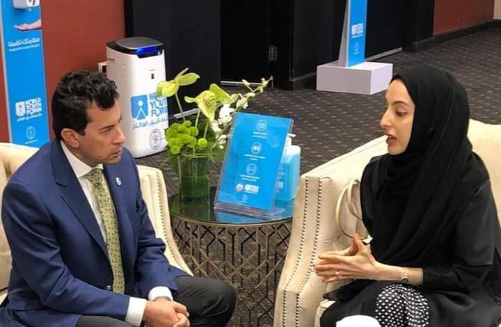 التقى الدكتور اشرف صبحي وزير الشباب والرياضة رئيس المكتب التنفيذي لمجلس وزراء الشباب والرياضة العرب ، معالي شما المزروعي وزيرة الدولة لشؤون الشباب بدولة الإمارات نائب رئيس مركز الشباب العربي، وذلك اليوم الاثنين ١٠ يناير ٢٠٢٢، وذلك على هامش مشاركتها كمتحدثة في الجلسة العامة الرئيسية لمنتدى شباب العالم “جائحة كورونا .. انذار للانسانية وأمل جديد “، بتشريف فخامة الرئيس عبد الفتاح السيسي.
