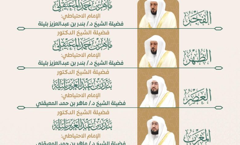 رئاسة الشؤون الدينية تعلن جدول الأئمة المكلفين بإمامة الصلوات بالحرمين خلال اسبوع