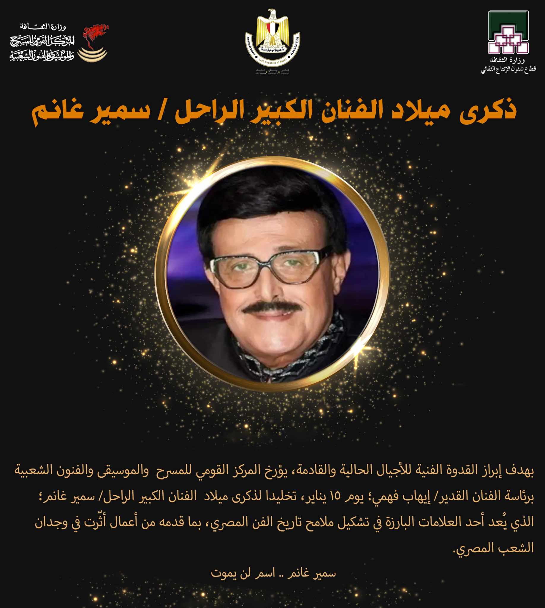 صرح الفنان القدير إيهاب فهمي- رئيس المركز القومي للمسرح والموسيقى والفنون الشعبية؛ أنه بدأ بالفعل من خلال إدارات المركز التوثيقية؛ تأريخا موثقا لذكرى ميلاد قامات مصر الفنية، والإعلان التوثيقي الدوري في مناسبة ذكرى مولد رموزنا الفنية في مجالات المسرح والموسيقى والفنون الشعبية، وذلك بهدف التذكير بالقامات الفنية، وتعريف الأجيال الحالية والقادمة بالعلامات البارزة في تشكيل ملامح تاريخ الفنون المصرية الثلاثة؛ بما قدموه من أعمال أثرت في وجدان الشعب المصري، مؤكدا أن قامات مصر الفنية لن تُنسى.